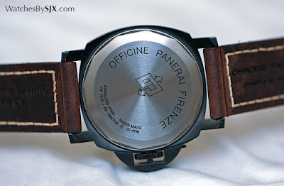 Die Luminor Black Seal Linkshänder 8 Tage Acciaio DLC ist typischer, mit einem 44 mm Stahlgehäuse mit einer schwarzen diamantartigen Carbon (DLC) Beschichtung.