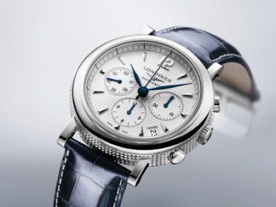 Ref. L2.704.4.16.3: Das Zifferblatt und Gehäusedeckel dieses Edelstahlmodells in der Longines Clous de Paris Kollektion unterstreicht die Finesse und die sorgfältige Arbeit der Handwerker der Marke. Diese Uhr verfügt über ein mechanisches Uhrwerk (L696) mit 28.800 Halbschwingungen pro Stunde und einer Gangreserve von 46 Stunden. Das mattweiße Zifferblatt ist mit einer arabischen Ziffer "12" und 11 rhodinierten Indexen versehen. es zeigt die Stunden und Minuten und die Sekunden um 9 Uhr sowie das Datum um 4 ½ Uhr an. Die Chronographenfunktionen umfassen einen Zentralsekunden-Sekundenzeiger, einen 30-Minuten-Zähler bei 3 Uhr und einen 12-Stunden-Zähler bei 6 Uhr. Die transparente Rückseite zeigt die funkelnde Schönheit der Bewegung. Dieser Chronograph ist auf einem dunkelblauen Alligator-Armband erhältlich.